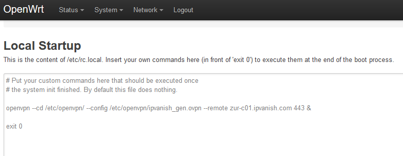 If you’d like your VPN connection to run at startup, login to the web-interface go to the System dropdown, then select Startup. In the box at the bottom, paste the following command before exit 0. The ampersand tells OpenWrt not to output anything to the screen.